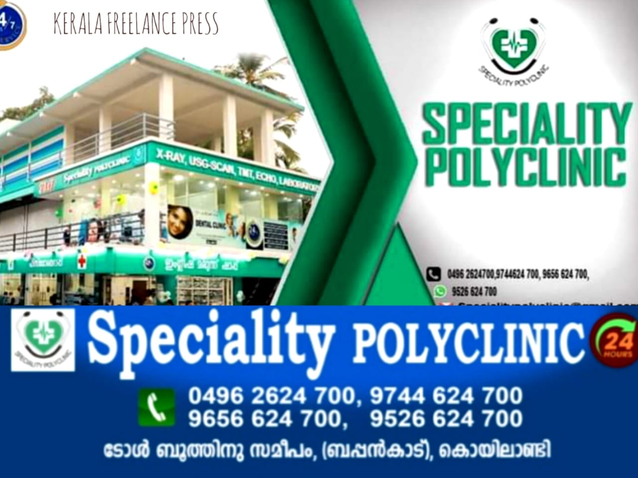 കൊയിലാണ്ടിയില് ഡോക്ടറുടെ സേവനം, ലബോറട്ടറി (ISO 9001:2015 Certified ), ഫാര്മസി, എക്സ് -റേ, ഇസിജി, ഒബ്സെര്വേഷന് & പ്രൊസീജ്യര് റൂം എന്നീ സേവനങ്ങള് 24 മണിക്കൂറും ലഭ്യമാക്കുന്നു സ്പെഷ്യാലിറ്റി പോളിക്ലിനിക്.